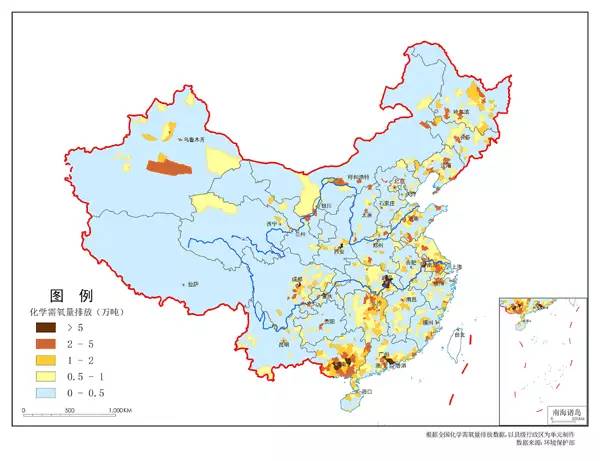 “化學需氧量(COD)”是一種評價水體污染程度的綜合性指標,是指利用化學氧化劑(如重鉻酸鉀)將水中的還原性物質(如有機物)氧化分解所消耗的氧量。中國化學需氧量排放分布與二氧化硫排放分布類似,主要分布在比較發達的城市及工業化程度較高的城市群群。