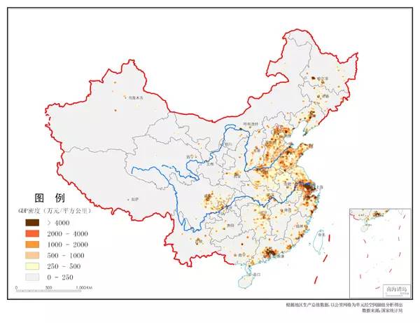 我國地均地區生產總值最高的地區主要分布在河北、山東、江浙及沿海地區,地均地區生產總值高于2000萬元/平方公里,但分布不到中國國土面積的1/10。廣大的中部地區、西北部及西南一帶地均地區生產總值較低。推進西部大開發、中部崛起以及振興東北形勢依然緊迫。